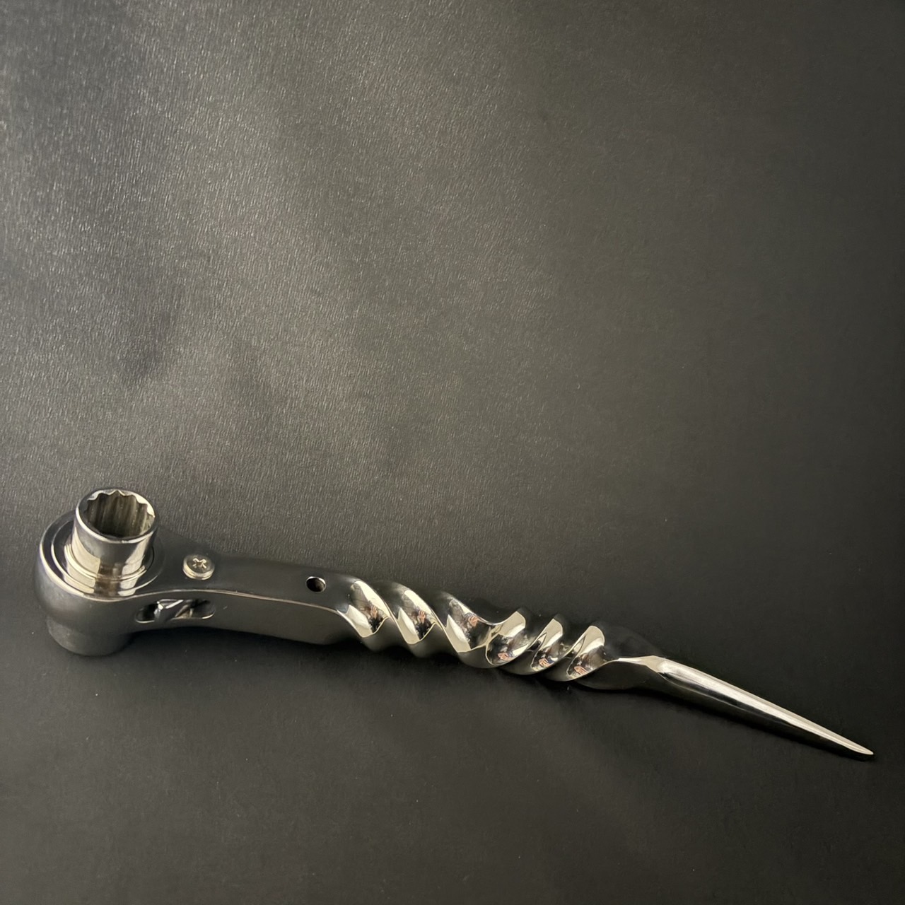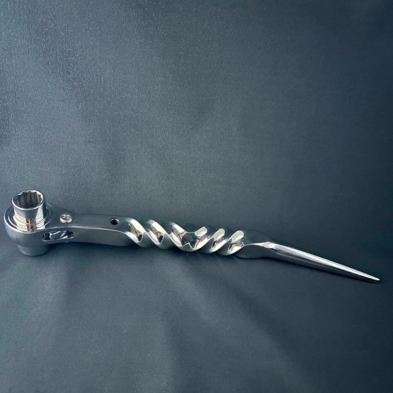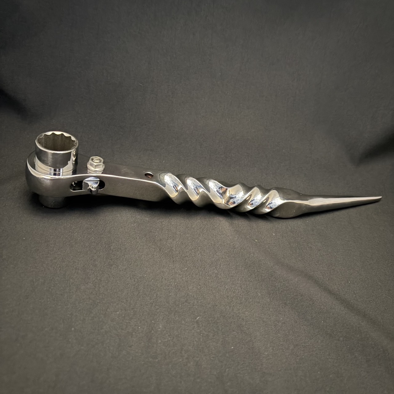 こちらのYS-RはSUS極太ラチェット17x21 シノ鳶仕様をツインツイスト(2回転ずつ逆方向に捻じっています)し仕上げてもらいました。(オールステン)